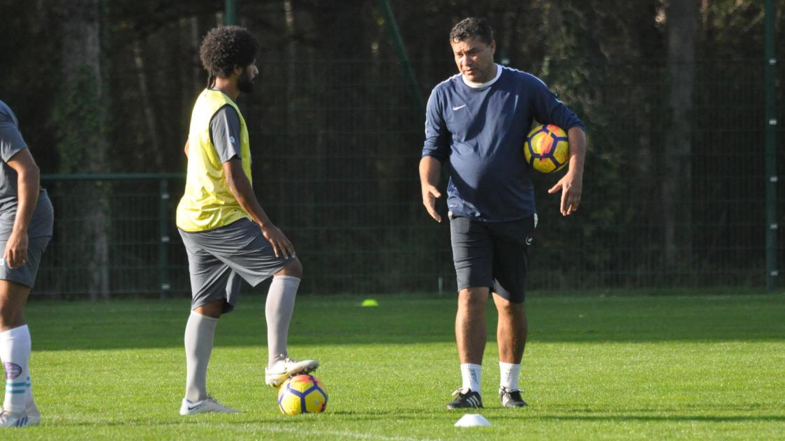 Crédit : Journal L'UNION | Le coach Félix TAGAWA, ici sur l'un des terrains d'entraînement de Clairefontaine avec Joseph ATHALE, ce dernier qui disputera samedi son dernier match avec Hienghène avant de tenter l'aventure football en métropole.