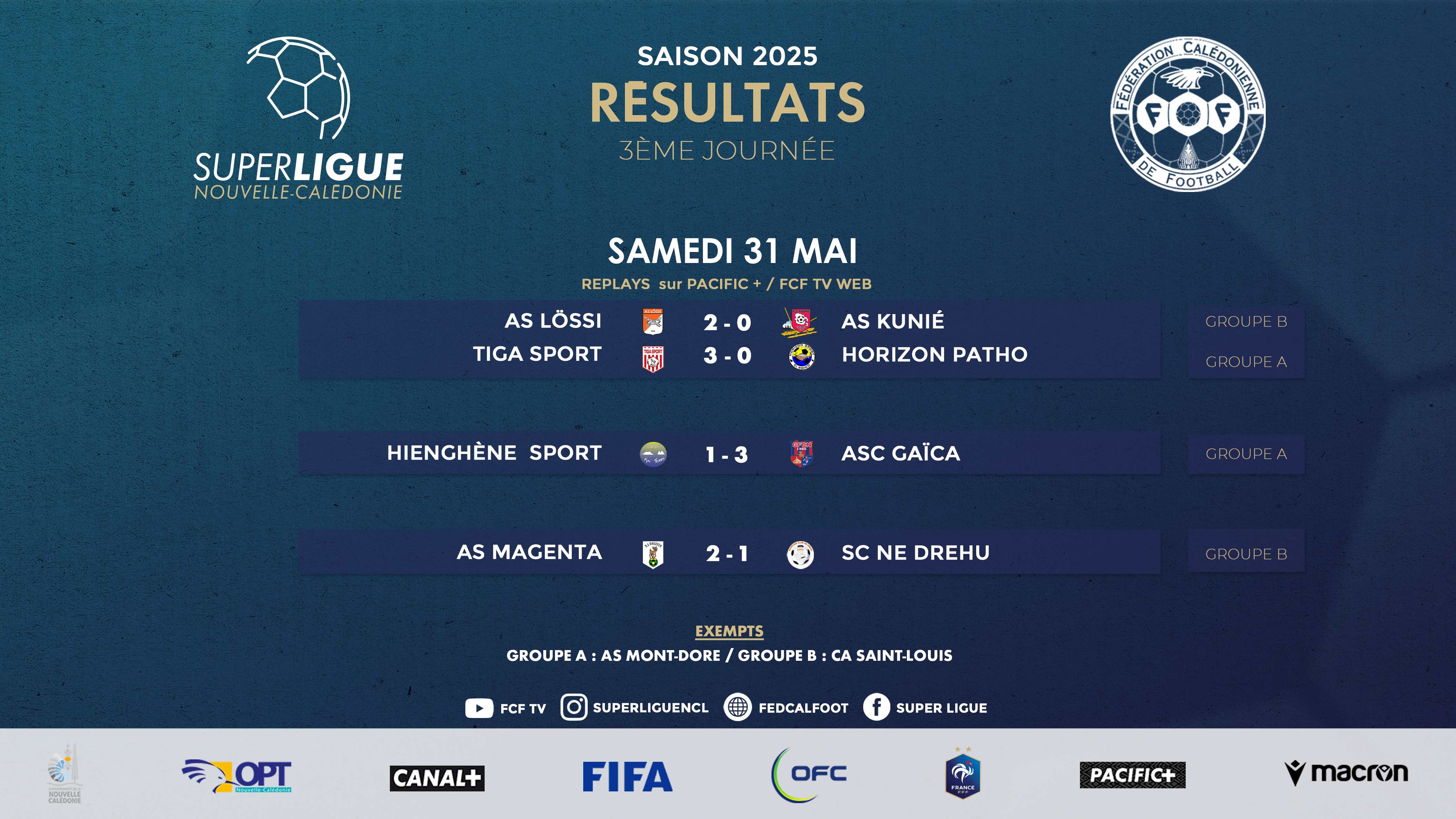 𝑺𝑼𝑷𝑬𝑹 𝑳𝑰𝑮𝑼𝑬 𝟐𝟎𝟐𝟓 [𝑱𝒐𝒖𝒓𝒏𝒆́𝒆 𝟑] | Les résultats et le classement de cette 3ème journée de Super Ligue = Tiga Sport (groupe A) et l'As Magenta (groupe B) prennent la tête dans leurs poules respectives, après leurs victoires face à l'Horizon Patho (3-0) et le Sc Ne Drehu (2-1). L'Asc Gaïca et l'As Lössi font également une bonne opération en battant Hienghène Sport (3-1) et l'As Kunié (2-0).