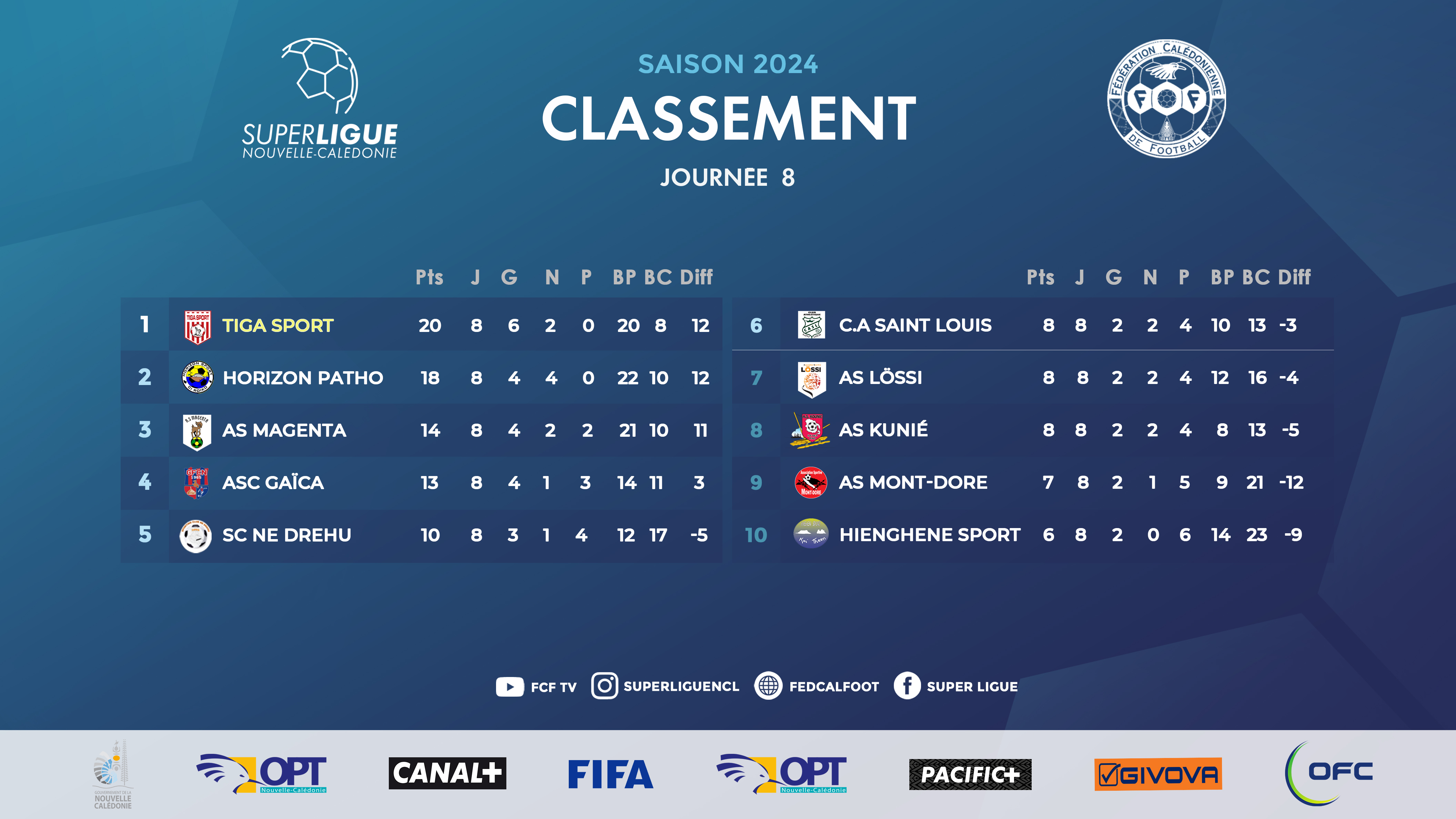 SUPER LIGUE 2024 [Journée 8] L'HORIZON PATHO face à KUNIE (4-0), le MONT-DORE face à SAINT-LOUIS (2-1) et LÖSSI face à HIENGHENE (3-1) s'offrent un succès lors de cette 8ème journée / Pas de vainqueur dans le duel GAÏCA-TIGA (1-1) et MAGENTA-NE DREHU (1-1)