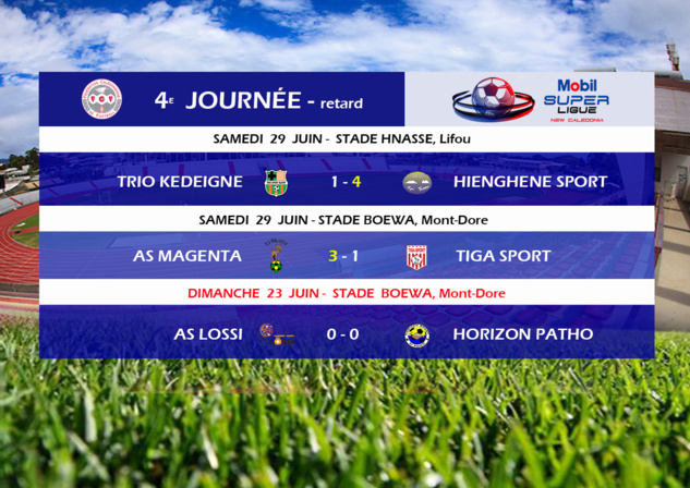 Deux matchs en retard de la 4ème journée de la MOBIL SUPER LIGUE se jouaient en ce samedi 29 juin. A Lifou, Hienghène a confirmé son leadership sur le championnat en battant Trio 4 buts à 1. A Boulari, Magenta a dominé Tiga 3 buts à 1 et se replace à la seconde place du classement. Sept points séparent Hienghène Sport de l'ASM.