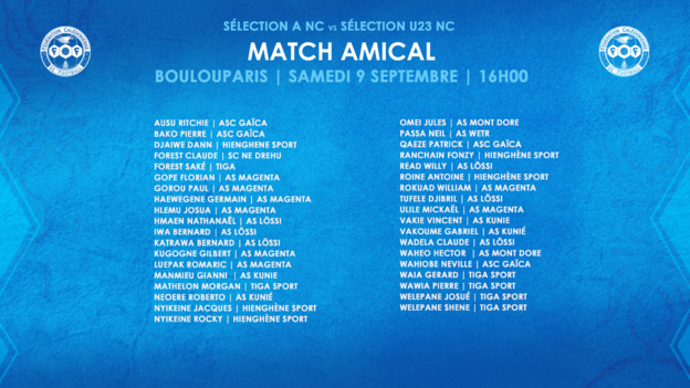 MATCH AMICAL - SELECTION A NC vs SELECTION U23 NC | Dans le cadre de la préparation des prochains JEUX DU PACIFIQUE, le Sélectionneur de la Calédonie JOHANN SIDANER convoque 37 joueurs pour une rencontre amicale programmée le samedi 9 septembre à BOULOUPARIS (coup d'envoi 16H00) #espritcagou