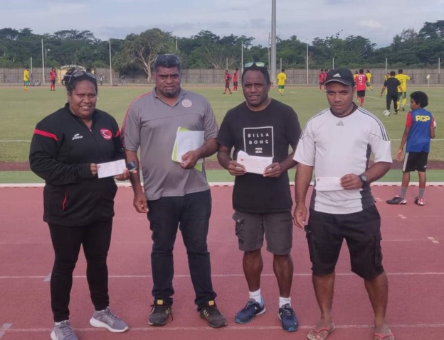 Marcel UNË (2ème Vice-Président de la FCF, à gauche), Gilles TAVERGEUX (Président la FCF, au centre à droite), et Christian LAWI (Président du Comité Iles), ont remis ce samedi au Stade Hnassé les fonds d'aide au club du SC NE DREHU, actuel 4ème de Super Ligue. Photo : FCF